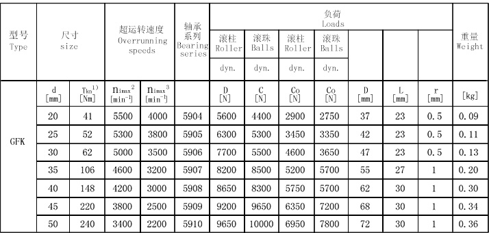 GFK型号为楔块式单向定位离合器,外型尺寸与59系列轴承相同。 此型设计特点为在最小外径尺寸获得最大扭力。内含黄油润滑及轴承支撑。